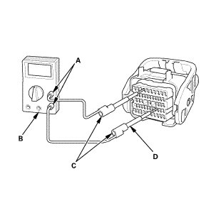 5. Connect one side of the patch cord terminals (A) to a commercially available digital multimeter (B), and connect the other side of the terminal (C) to a commercially available banana jack (Pomona Electronics Tool No. 3563 or equivalent) (D).