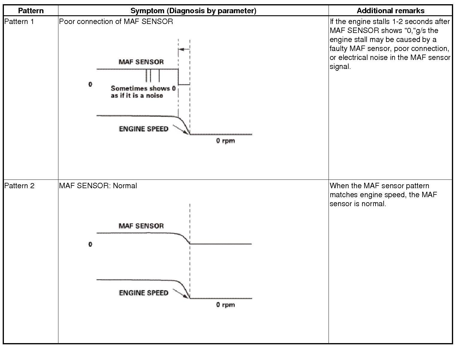 -Pattern 1- Check the MAF sensor for loose terminals or poor connections. If the terminals and connections are OK, substitute a known-good MAF sensor Service and Repair.