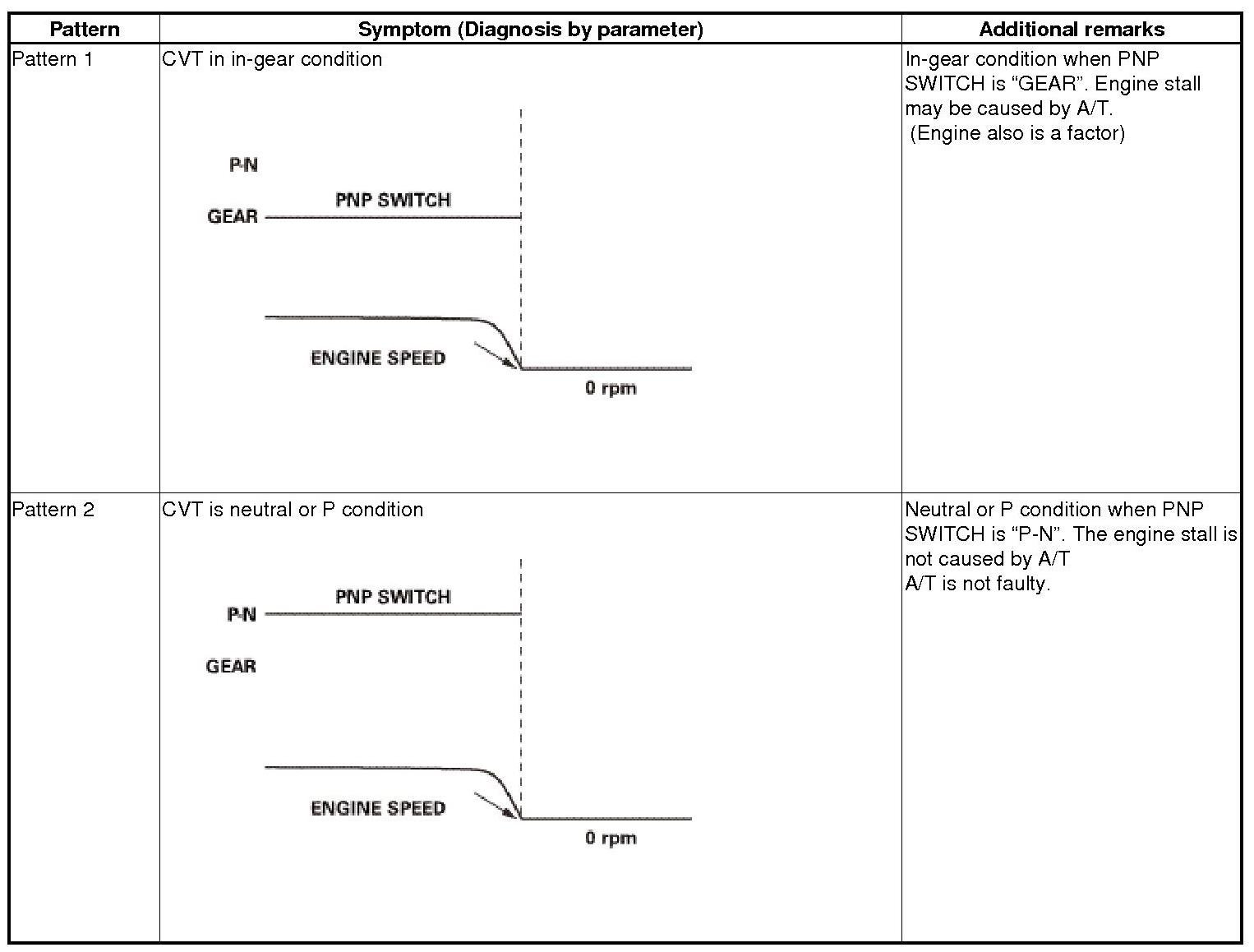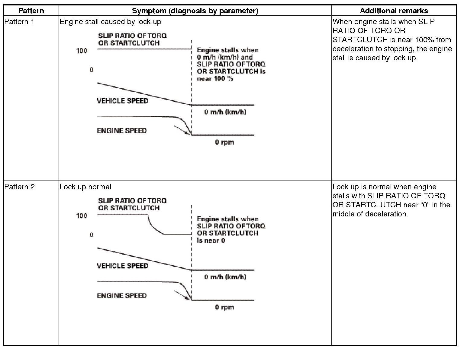 Check the recorded on-board snapshot parameters while the engine stall, then chose the SLIP RATIO OF TORQ OR STARTCLUTCH pattern from these charts, and determine the problem.