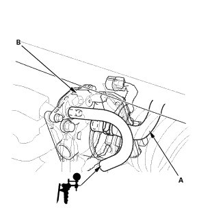 -3. Disconnect the vacuum hose (A) from the EVAP canister purge valve (B) in the engine compartment, and connect a vacuum pump/gauge, 0-30 inHg, to the EVAP canister purge valve.