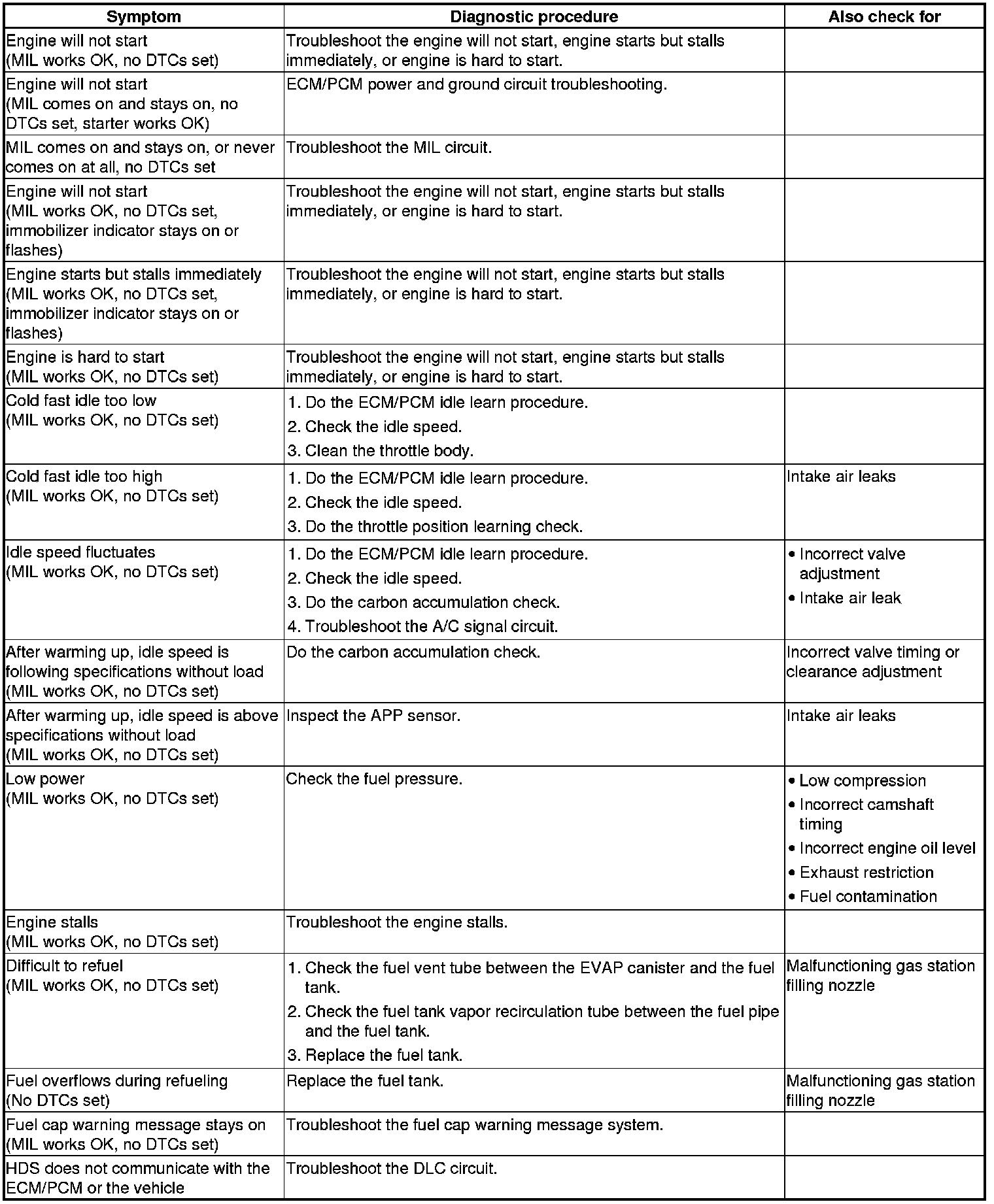When the vehicle has one of these symptoms, check for a diagnostic trouble code (DTC) with the HDS. If there is no DTC, do the diagnostic procedure for the symptom, in the sequence listed, until you find the cause.