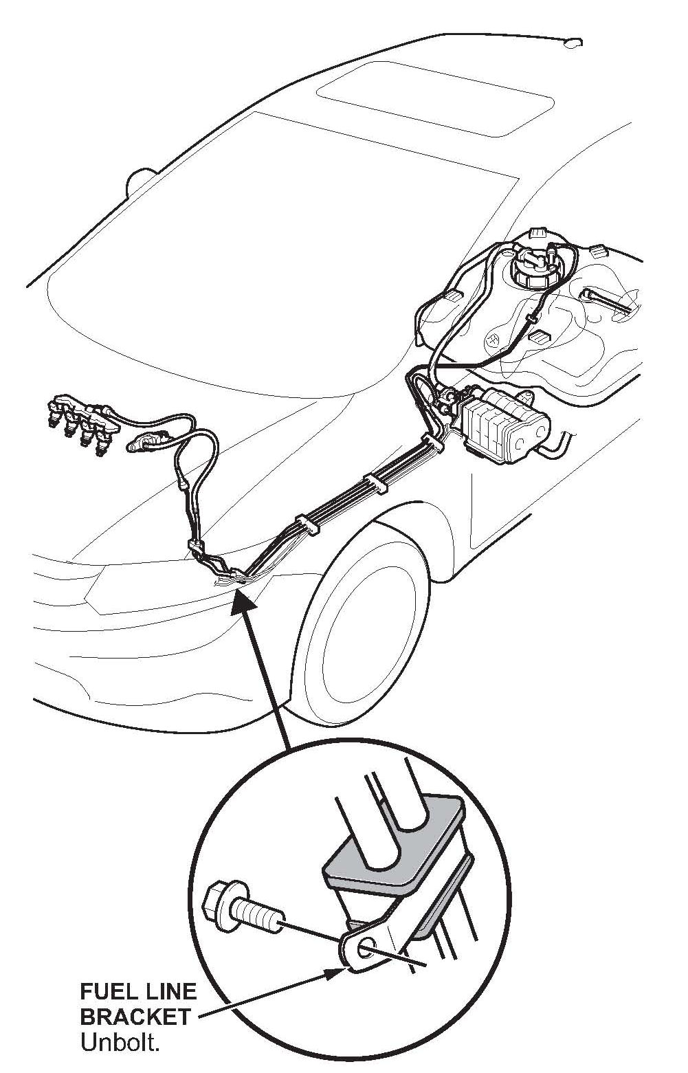 7. Remove the fuel line bracket, then slide the bracket off of the fuel and EVAP lines.