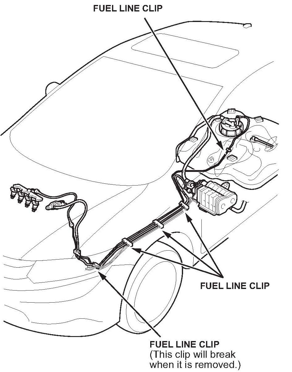 24. Remove the five fuel line clips from the vehicle.