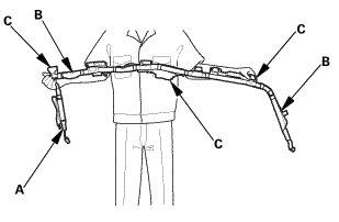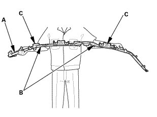 * The side curtain airbag module assembly is a long, jointed part containing an inflator (A), a flexible bag (B), and brackets (C). When removing or installing the side curtain airbag assembly, never:
