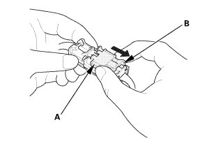 To reconnect, hold the pawl-side connector, and press on the back of the sleeve-side connector in the direction shown. As the two connector halves are pressed together, the sleeve (A) is pushed back by the pawl (B). Do not touch the sleeve.