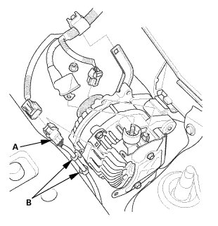 2. Remove the harness connector (A) and the harness clamps (B).