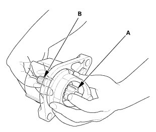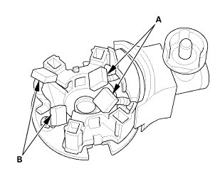 1. Check for continuity between the (+) brushes (A) and the (-) brushes (B). If there is continuity, replace the brush holder assembly.