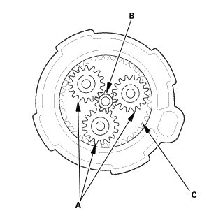 1. Check the planetary gears (A), the armature shaft gear (B), and the internal ring gear (C). Replace them if they are worn or damaged.