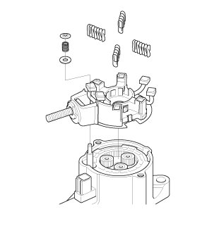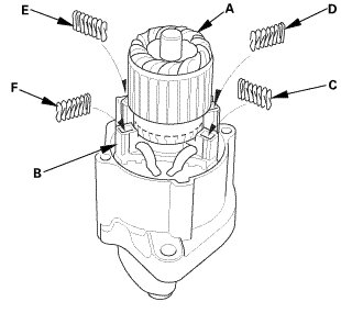 2. While squeezing a spring (C), insert it in the hole on the brush holder, and push it until it bottoms. Repeat this for the other three springs (D, E, and F).