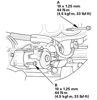 2. Install the starter, then loosely install the upper mounting bolt (A) and the lower mounting bolt (B).