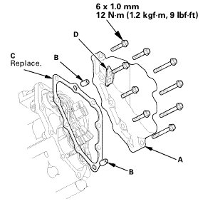 1. Install the shift solenoid valve cover (A) with the dowel pins (B), a new gasket (C), and the clamp bracket (D).