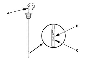 5. Make sure the fluid level is between the upper mark (B) and the lower mark (C) on the dipstick.