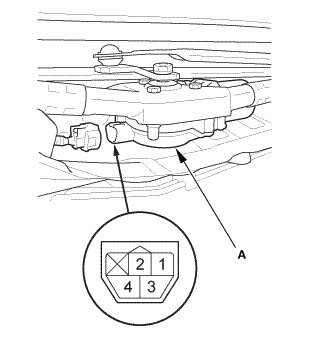 2. Test the wiper motor (A) by connecting battery power to terminal No. 2 and ground to terminal No. 1 of the wiper motor connector. The motor should run at low speed.
