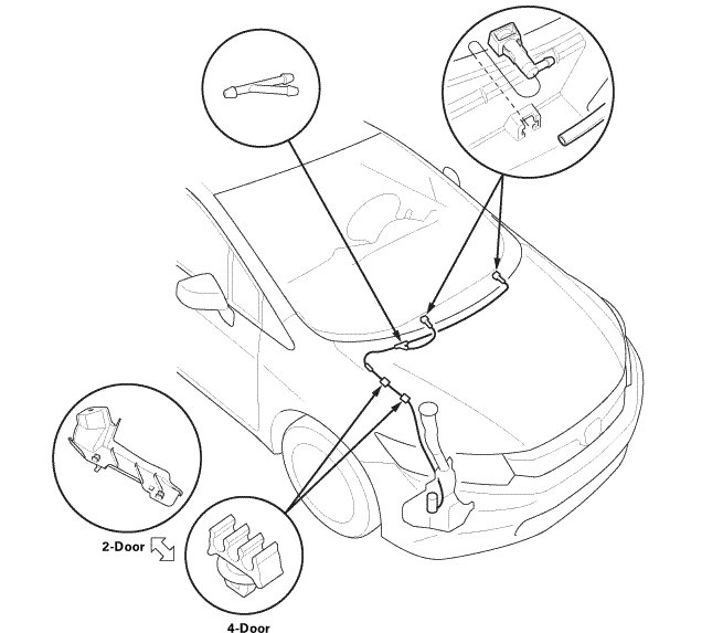 Remove the washer nozzles and the trim (2-door) or the clips (4-door), then remove the tubes.