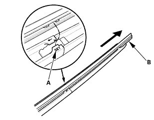 5. Pull back the end of the blade holder, and slide out the old wiper blade (B).