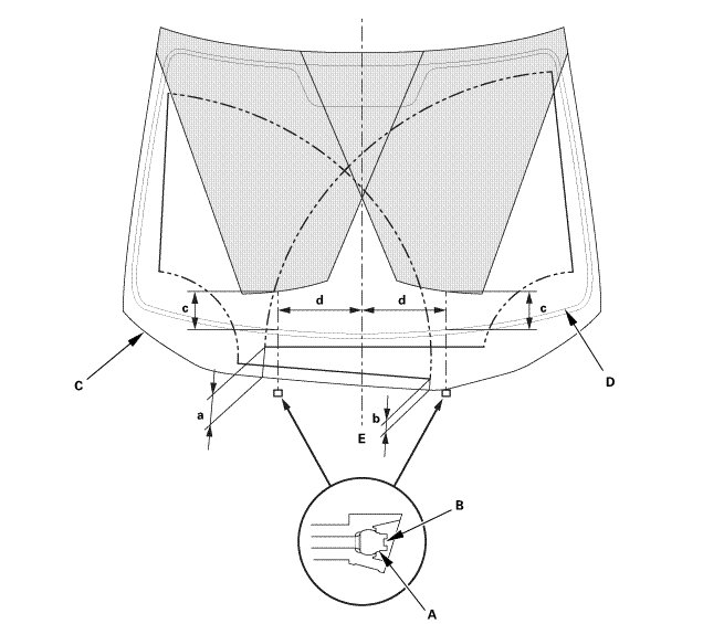 * Do not insert tools into the nozzle hole (B), as it may cause the washer fluid to spray incorrectly.