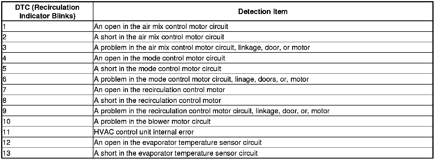 * Once the self-diagnostic function is finished, the recirculation indicator blinks, and the number of blinks indicates the Diagnostic Trouble Code (DTC) number. If there are multiple DTCs, the indicator blinks each DTC in sequence from the lowest DTC number to the highest.