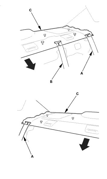 3. Pull out both rear seat belts (A) and the rear center seat belt (B) through the slits in the rear shelf trim (C), then remove the rear shelf trim.