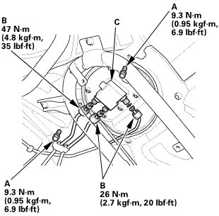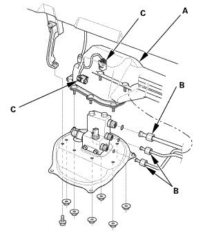 1. Remove the three fuel pipes (A) at the fuel joint block (B) and the two fuel joint block mounting bolts (C).