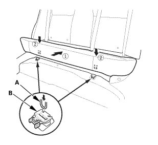 1. Install the hooks (A) to the rear seat cushion clips (B).