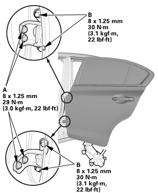 NOTE: Check for a flush fit with the body, then check for equal gaps between the front and rear doors, and between the doors, and the body. Check that the door and body edges are parallel.