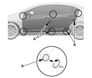 4. Check that the door and body edges are parallel. If necessary, adjust the door cushions (A) to make the rear of the doors flush with the body.