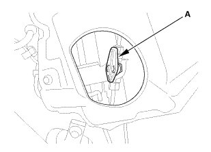 1. With the help of two other technicians, lift the frame, and slide the entire fuel tank assembly (A) into the passenger compartment from outside the vehicle. Be careful not to damage the fuel joint block.