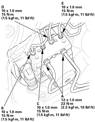 NOTE: Brake lines are connected to the master cylinder (A), the left-rear (B), the right-front (C), the left-front (D), and the right-rear (E) brake systems.