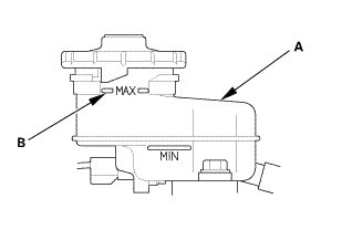 1. Make sure the brake fluid level in the reservoir tank (A) is at the MAX (upper) level line (B).