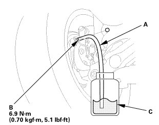 4. Submerge the other end of the drain tube into a clear plastic catch bottle of brake fluid (C).