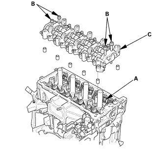 4. Insert the bolts (B) into the rocker shaft holder, then install the rocker arm assembly (C) on the cylinder head.