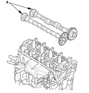 1. Make sure the punch marks on the VTC actuator and the exhaust camshaft sprocket are facing up, then set the camshafts (A) in the holder. Apply new engine oil to the camshaft journals and lobes.