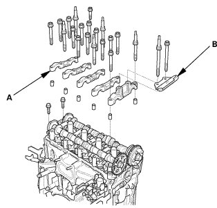 1. Set the camshaft holders (A) and cam chain guide B in place.