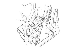 1. Compress the auto-tensioner when replacing the cam chain. Remove the pin (A) from the auto-tensioner that was installed during removal. Turn the plate (B) counterclockwise, to release the lock, then press the rod (C), and set the first cam (D) to the first edge of the rack (E). Insert the 1.2 mm (3/64 in) diameter pin back into the holes (F).