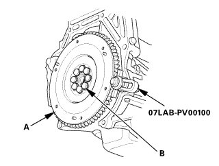 1. Install the flywheel (A) on the crankshaft, and install the mounting bolts (B) finger-tight.