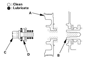 1. Clean the crankshaft pulley (A), the crankshaft (B), the bolt (C), and the washer (D). Lubricate with new engine oil as shown.