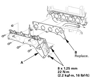 1. Install the intake manifold (A) with new gaskets (B), and tighten the bolts and nuts in a crisscross pattern in three steps, beginning with the inner bolt.