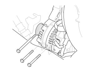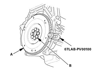 NOTE: Loosen the flywheel mounting bolts (B) in a crisscross pattern in several steps.