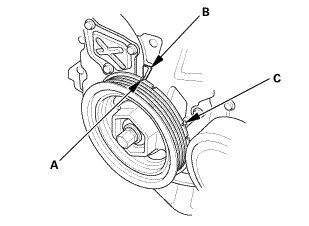 1. Set the No. 1 piston at top dead center (TDC). The punch mark (A) on the VTC actuator and the punch mark (B) on the exhaust camshaft sprocket should be at the top. Align the TDC marks (C) on the VTC actuator and the exhaust camshaft sprocket.