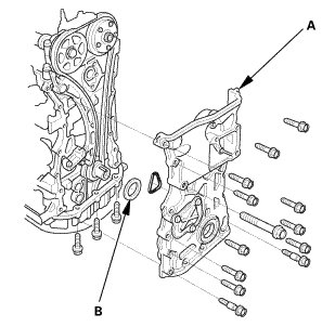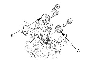 2. Remove the oil pump sprocket (A) and the oil pump chain guide (B).