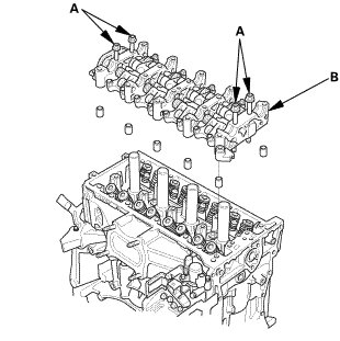1. Insert the bolts (A) into the rocker shaft holder, then remove the rocker arm assembly (B).
