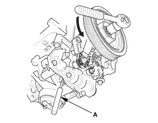 1. Hold the pulley with the holder handle (A) and the crankshaft pulley holder (B).