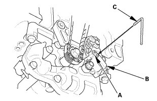 3. Rotate the crankshaft counterclockwise to align the holes on the lock (A) and the auto-tensioner (B), then insert a 1.2 mm (3/64 in) diameter pin (C) into the holes. Turn the crankshaft clockwise to secure the pin.