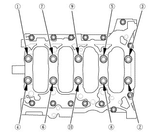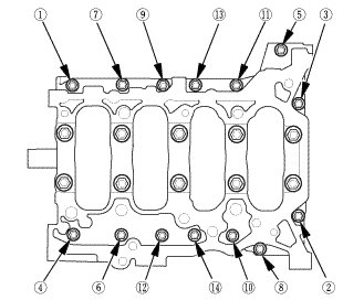2. Remove the bearing cap bolts. To prevent warpage, loosen the bolts in sequence 1/3 turn at a time; repeat the sequence until all bolts are loosened.