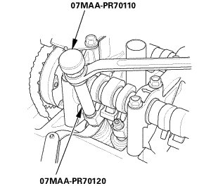 1. Set the No. 1 piston at top dead center (TDC). The punch mark (A) on the VTC actuator and the punch mark (B) on the exhaust camshaft sprocket should be at the top. Align the TDC marks (C) on the VTC actuator and the exhaust camshaft sprocket.
