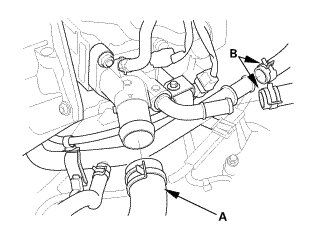 1. Connect the upper radiator hose (A) and the heater hoses (B).