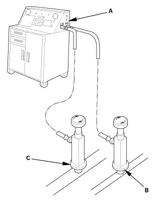 1. Connect an R-134a refrigerant recovery/recycling/charging station (A) to the high-pressure service port (B) and the low-pressure service port (C), as shown, following the equipment manufacturer's instructions.