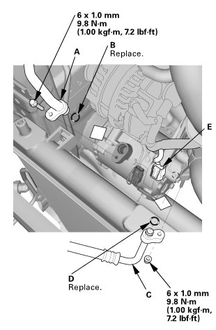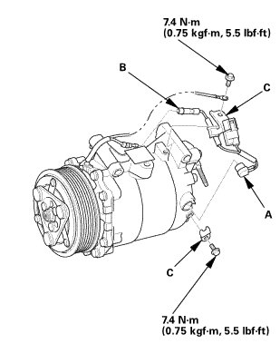4. Connect the discharge hose (C) with a new O-ring (D) that is lubricated with clean refrigerant oil.