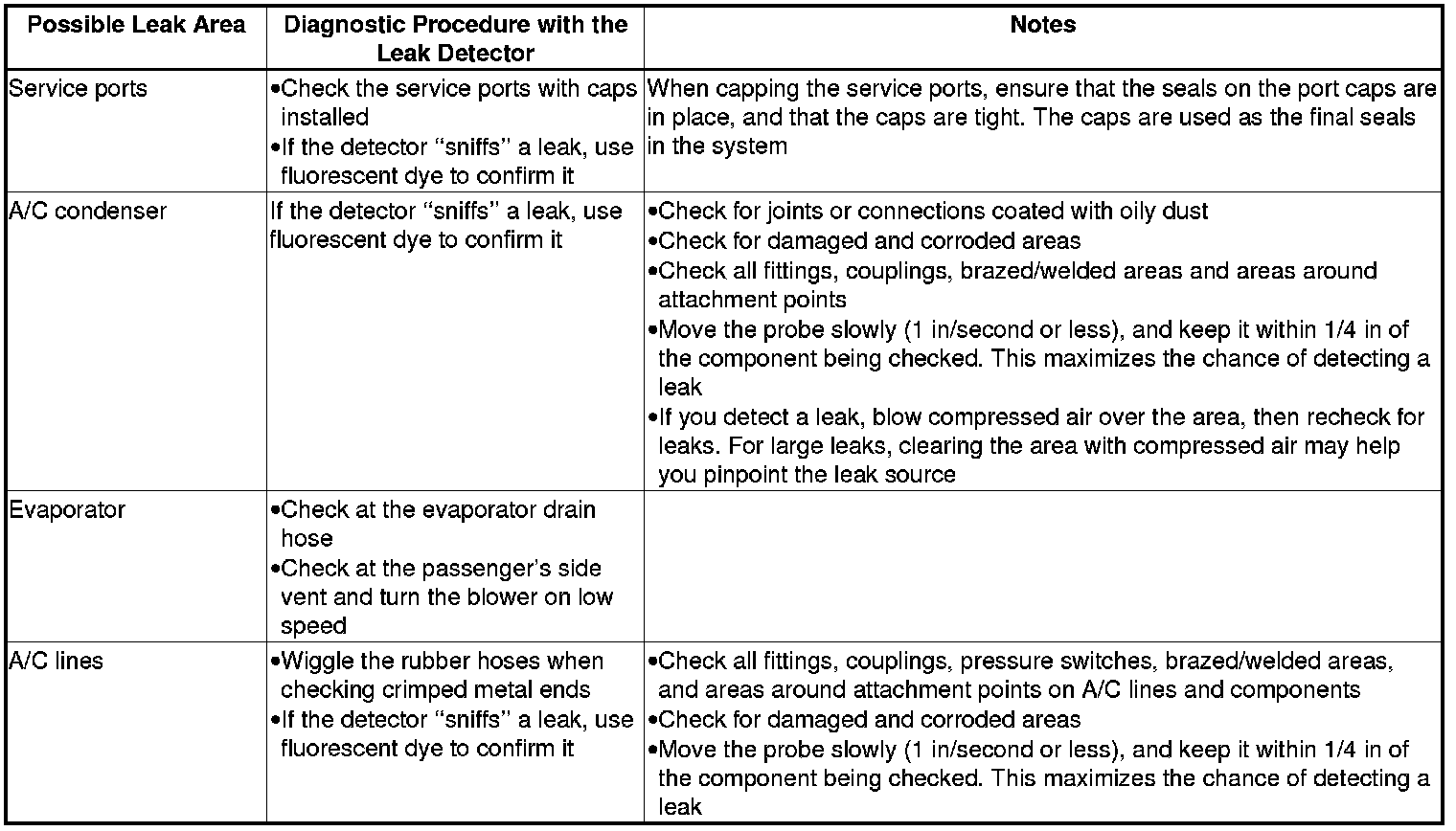 * R-134a is heavier than air; always check below and to the sides of all potential leak sources.