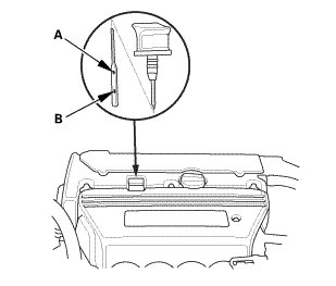 3. Check the engine oil level. It should be between the upper mark (A) and the lower mark (B).